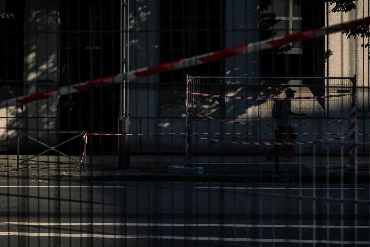 La ville retient son souffle, figée dans un crépuscule où les ombres s’étirent éternellement. L’air est devenu irrespirable, la lumière rare. L’exode a commencé. Ici et là, les traces de ceux qui ont fui et la présence spectrale de ceux qui hésitent encore.